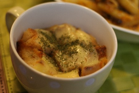 それをオーブンで焼いて焦げ目を付けて、それをスープの上に乗っけてみました。