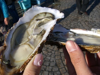 食後は満腹でお腹をさすりつつ歩いていると、おじさんが牡蠣を開いてる。