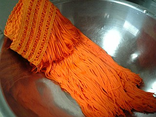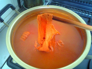 まずはデカイ鍋に熱湯を沸かし、染料を入れてフリンジを染めて、
