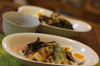 ・ぶっかけうどん(ちくわ揚げ・ゆで卵・かつおぶし・ゴマ・海苔)