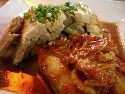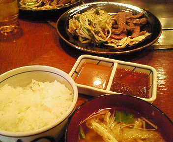 お肉と野菜がお皿にこんもり盛られ、タレは辛子ダレと醤油ダレの2種が楽しめます。