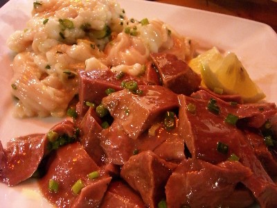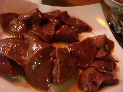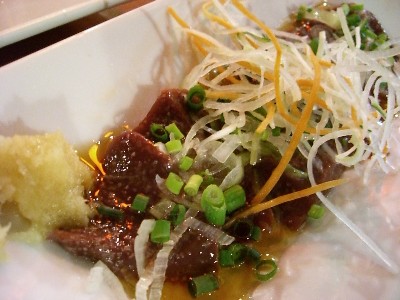 レバー。刺身でもいけるものなので、サッと炙って食べるんだよ。