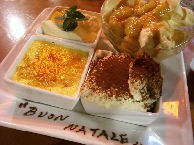 デザート4種盛り。ホットバナナとアイス・パンナコッタ・ティラミス・