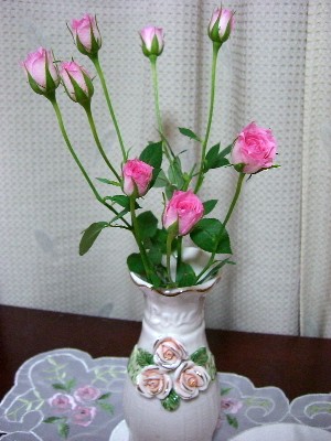 今日は買物がてらピンクのミニ薔薇を買ってきて、薔薇の花瓶に活けました。チョーかわいい!