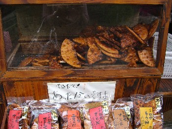 お店の人が売り物のお煎餅をたくさん試食させてくれました。焼きたてでおいしいぃ~♪