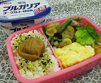 ちゃんと早起きしてお弁当を作りました。昨日の夕飯の残り物がたくさんあったので助かったよ☆