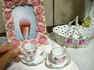 手前にあるのがミニカップ&ソーサー。小さな薔薇の飾りが付いてて超かわいい!