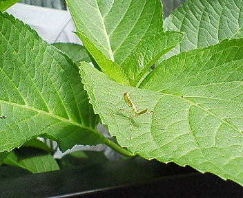 我が家の庭のあじさいの葉っぱに乗っかってたカマキリの赤ちゃん。2cmぐらいでした