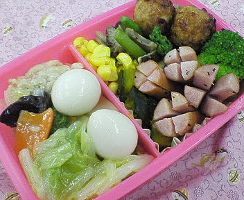八宝菜は昨日の夕飯の残りです。うずらの卵を二つも入れてきちゃった♪